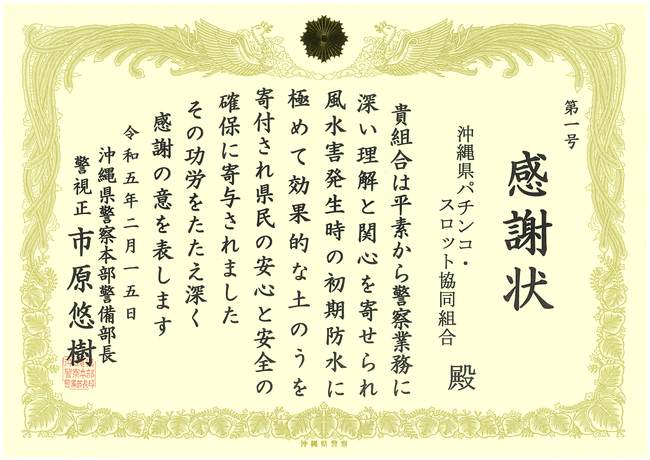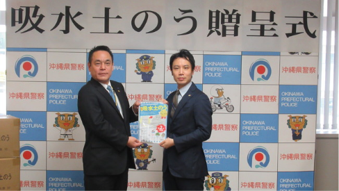 〇当組合(新垣善彦理事長)は、2023年2月15日(水)、警察本部(警備第二課)を訪れ、災害発生時に役立ててもらおうと「吸水土のう200袋」を贈呈しました。