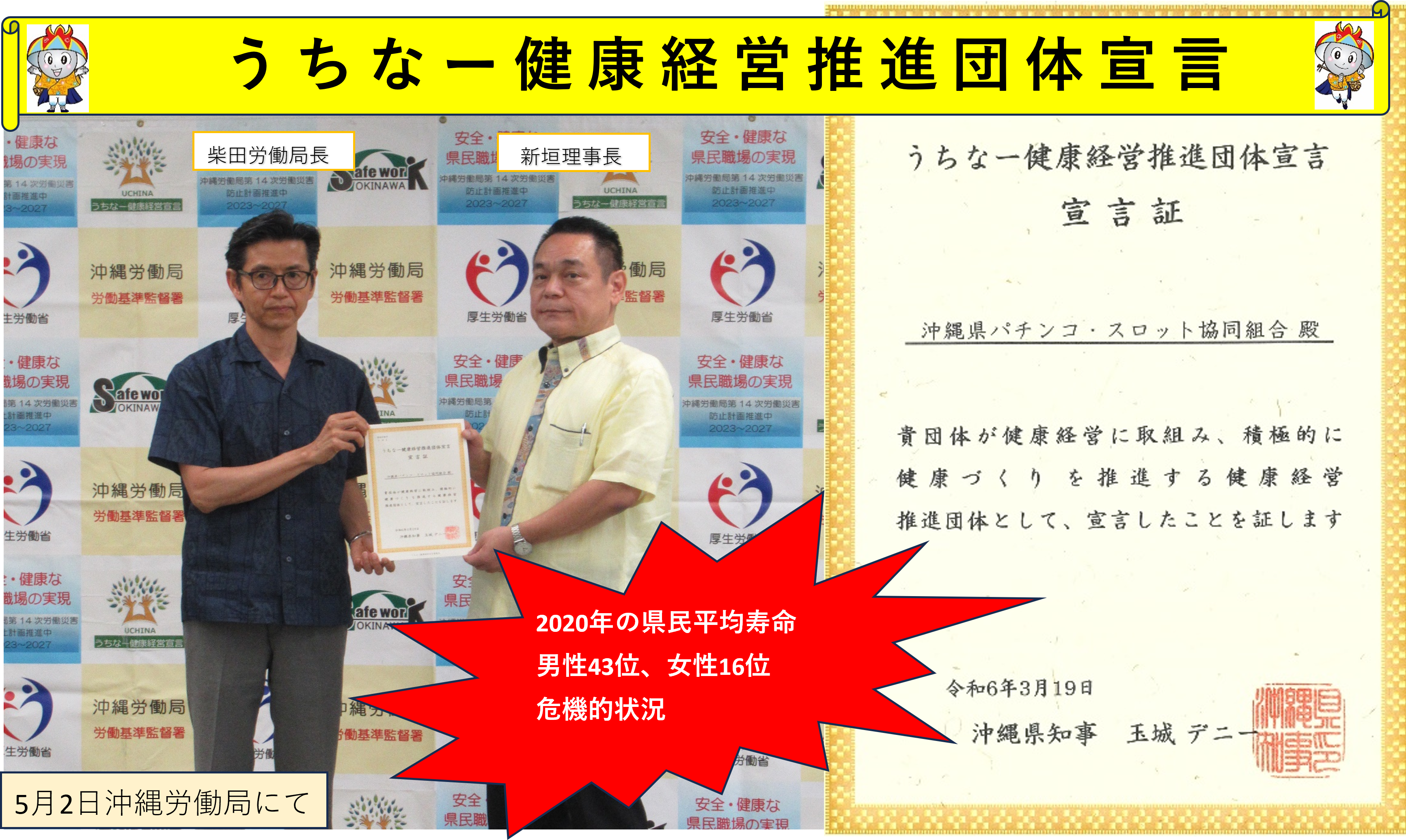 極的に労働者の健康増進に取り組むために、3月19日に「うちなー健康経営推進団体宣言」をし、同宣言証(沖縄知事名)の伝達式が5月2日(木)沖縄労働局(柴田局長)で行われました。